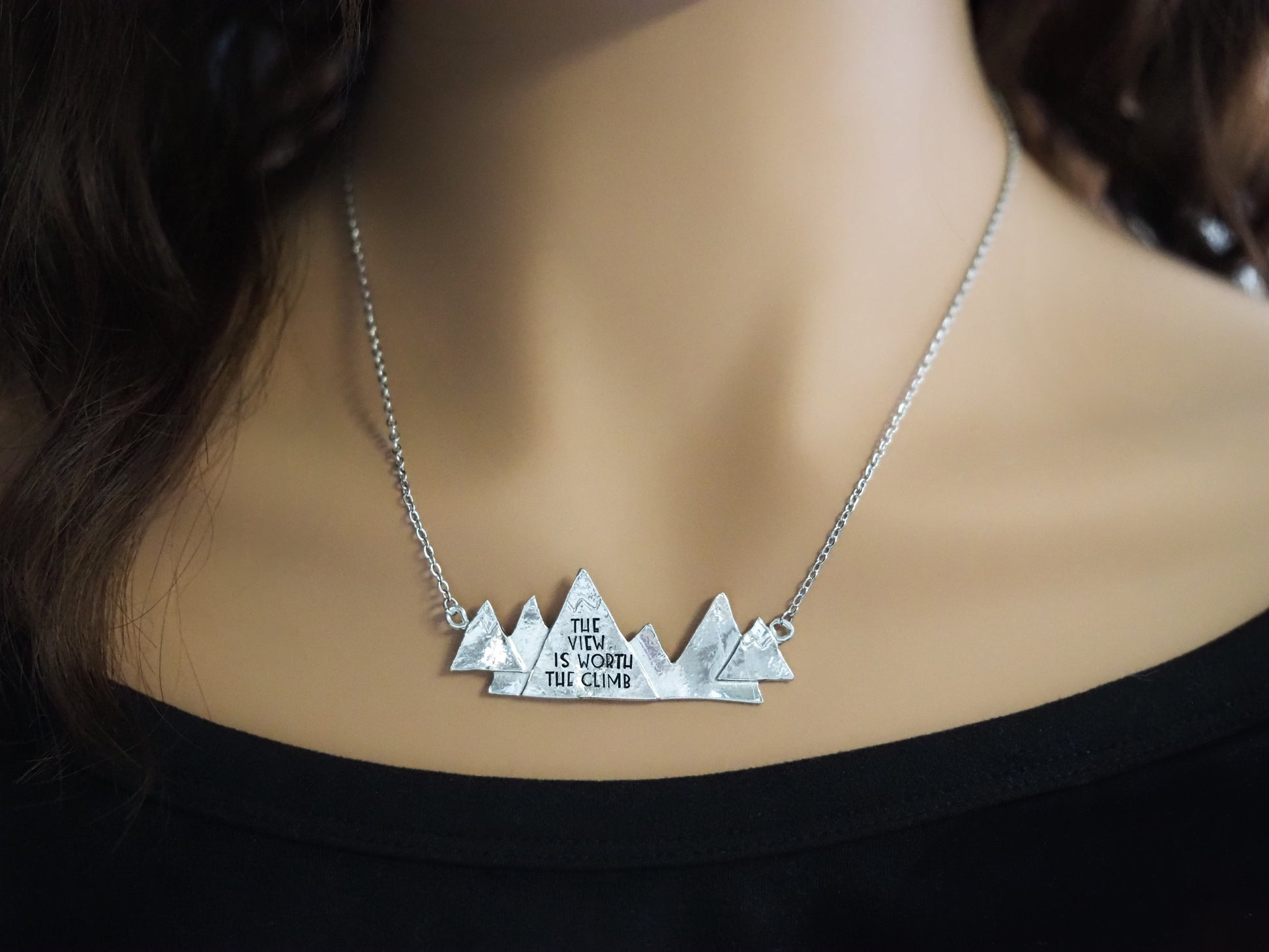 A reminder that every challenge is worth the journey, this pewter necklace features a rugged mountain design hand-stamped with the phrase "the view is worth the climb." Measures 18" in length. Whether you're an adventurer at heart or simply need a little motivation, this necklace is a perfect daily reminder to keep pushing forward.